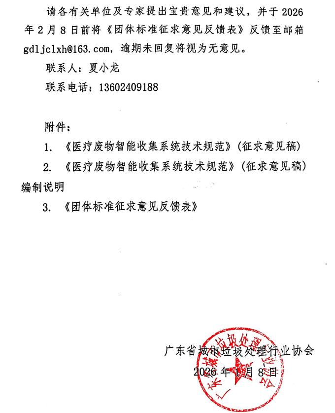 - 关于征求《医疗废物智能收集系统技术规范》团体标准意见的通知 [2026-01-08]